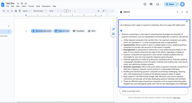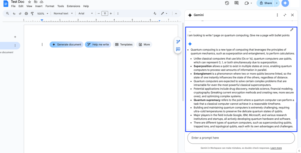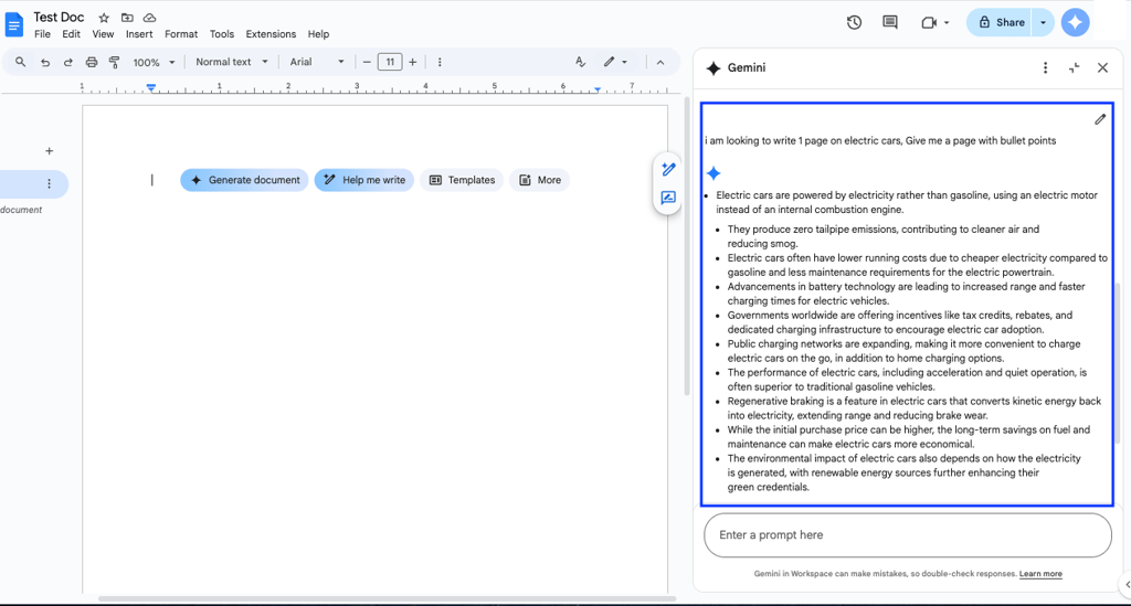 Gemini for Google Docs proved itself to be a reliable assistant for structured content creation. From technical topics like quantum computing to trending areas like electric cars, it handled each prompt well, producing clean, scannable bullet points.