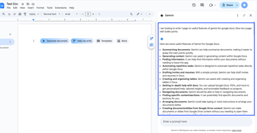 Prompt: “I am looking to write 1 page on useful features of Gemini for Google Docs. Give me a page with bullet points.”