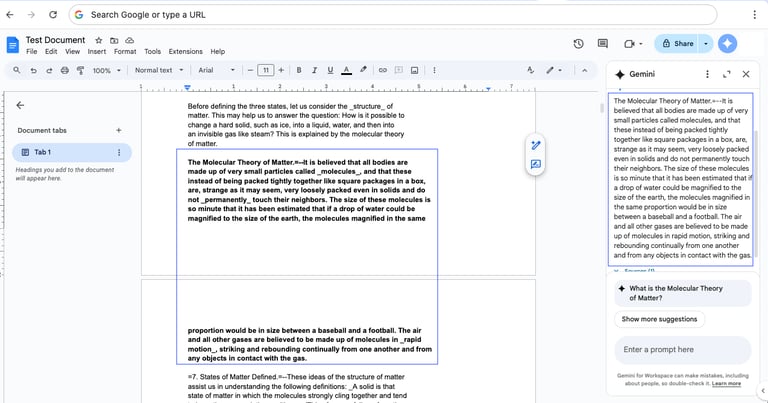 One of Gemini's most commonly used features is summarization—and for good reason. When asked to “Summarize the first two paragraphs,” Gemini produces a fairly accurate and contextually relevant summary most of the time.